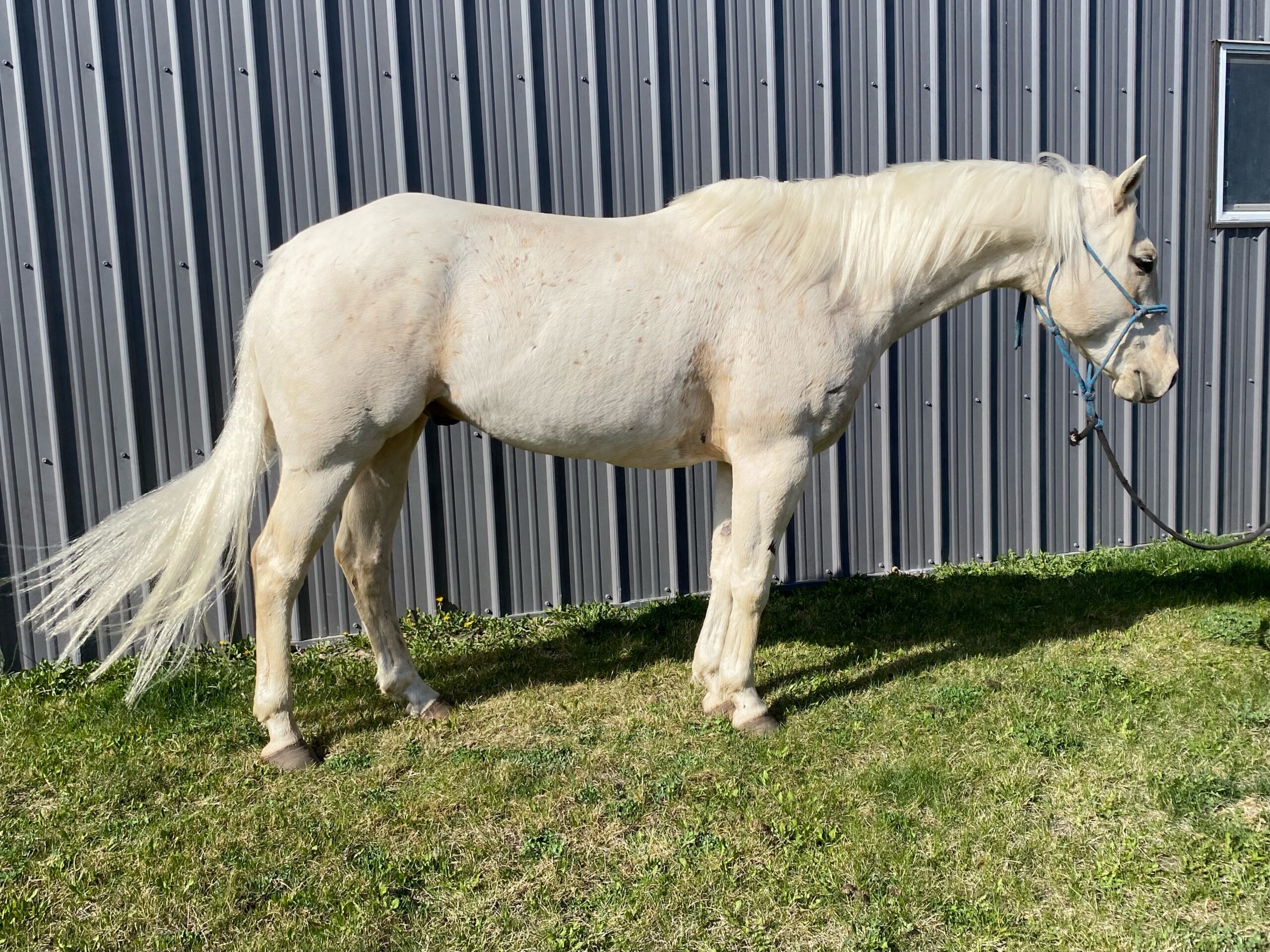 Moe is a gelding that stands out in a pen of horses with his unique color and kind disposition! With his long stride and smooth gait, he will make someone a great prospect!
