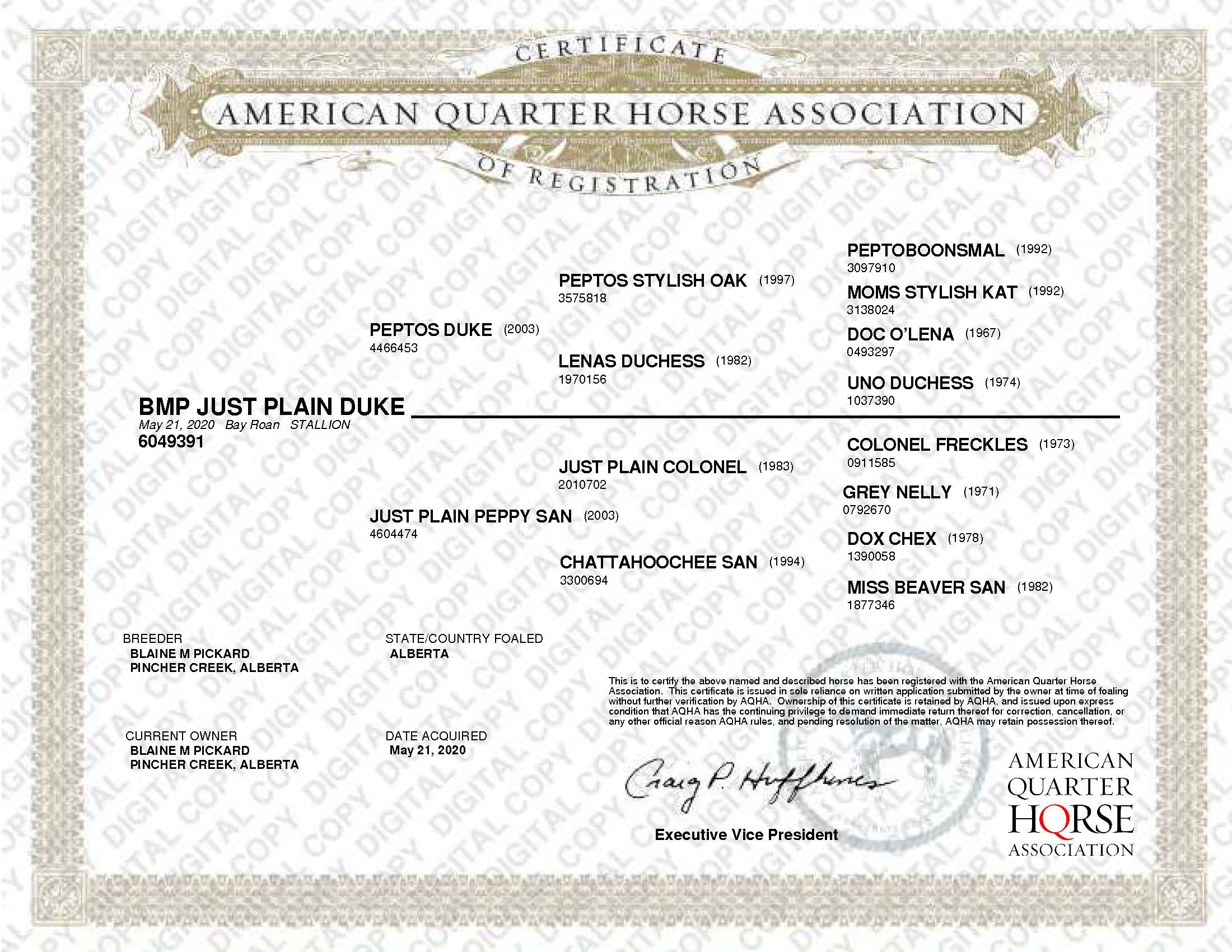 The colt has a stacked cow horse pedigree without doubt – both sides of the pedigree! I thought enough of this colt that I didn’t geld him. I believe he has the potential to be a stallion prospect. Both testicles are present. He should mature around 15 hands.