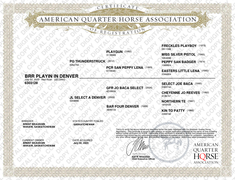This flashy 4-year-old gelding would be a great addition to the ranch. Bingo has been exposed to a range of ranch work such as, pasture doctoring, brandings and pulling cattle in the feedlot. He has also spent time in an arena working the flag and cattle. With the right person this gelding has the potential to advance in the roping end of the arena or cowhorse events. His sire PG THUNDERSTRUCK is a proven money earner in the cowhorse pen in Canada. Bingo would best suit a more advanced rider as he had a lot of feel and a big motor. He is up to date on his teeth, deworming and farrier.