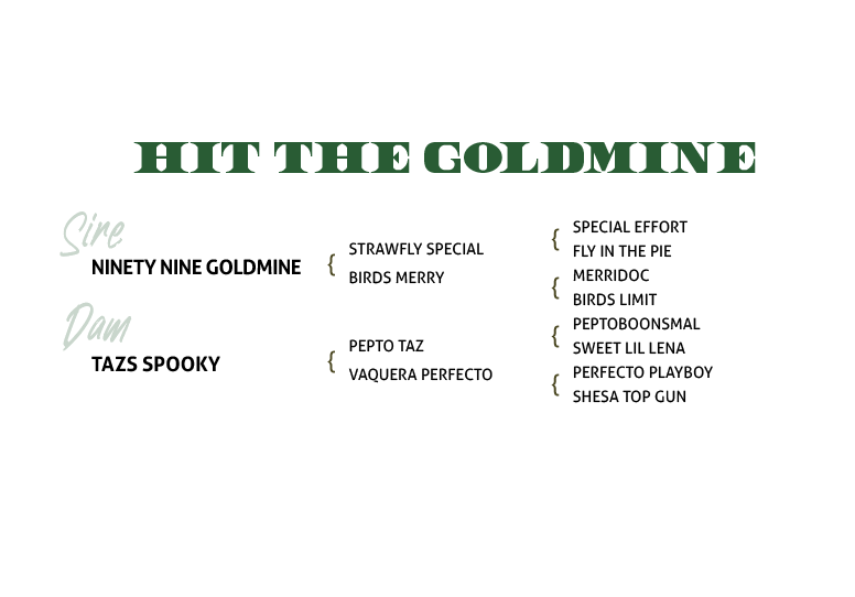 He is by the outstanding AAA stallion Ninety Nine Goldmine who has produced several winning horses, especially in the barrel racing industry! This colt is out of a great mare from the Gonnet program Tazs Spooky, who has been hauled to cuttings across the country as one of the best turn back horses, has barrel raced, been roped off of, and just an all-around great using horse.