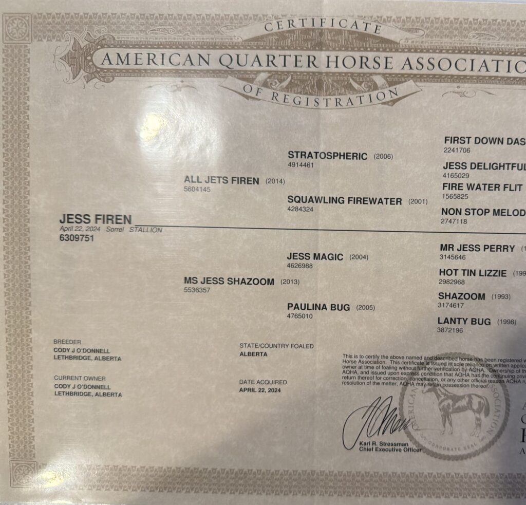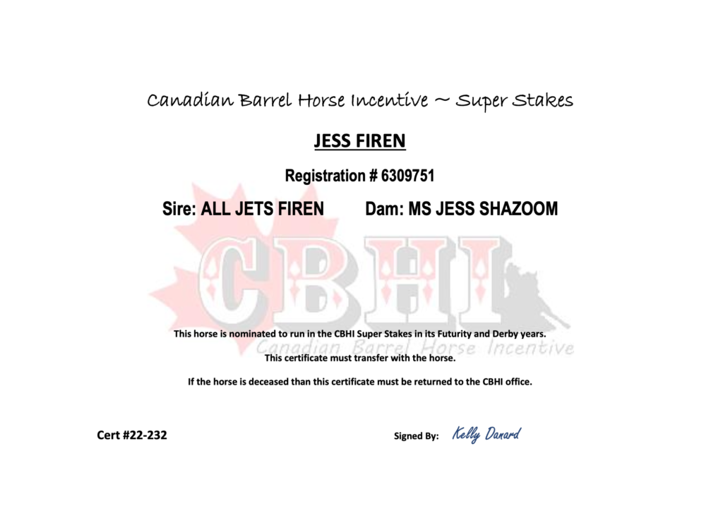 Jess Firen has a well balanced conformation that will allow him to succeed at any type of work. He has a nice wither, straight legs, good bone, good feet, and strong topline with good hip. He sells with a Superstakes certificate which paid out $183,000 in 2025.